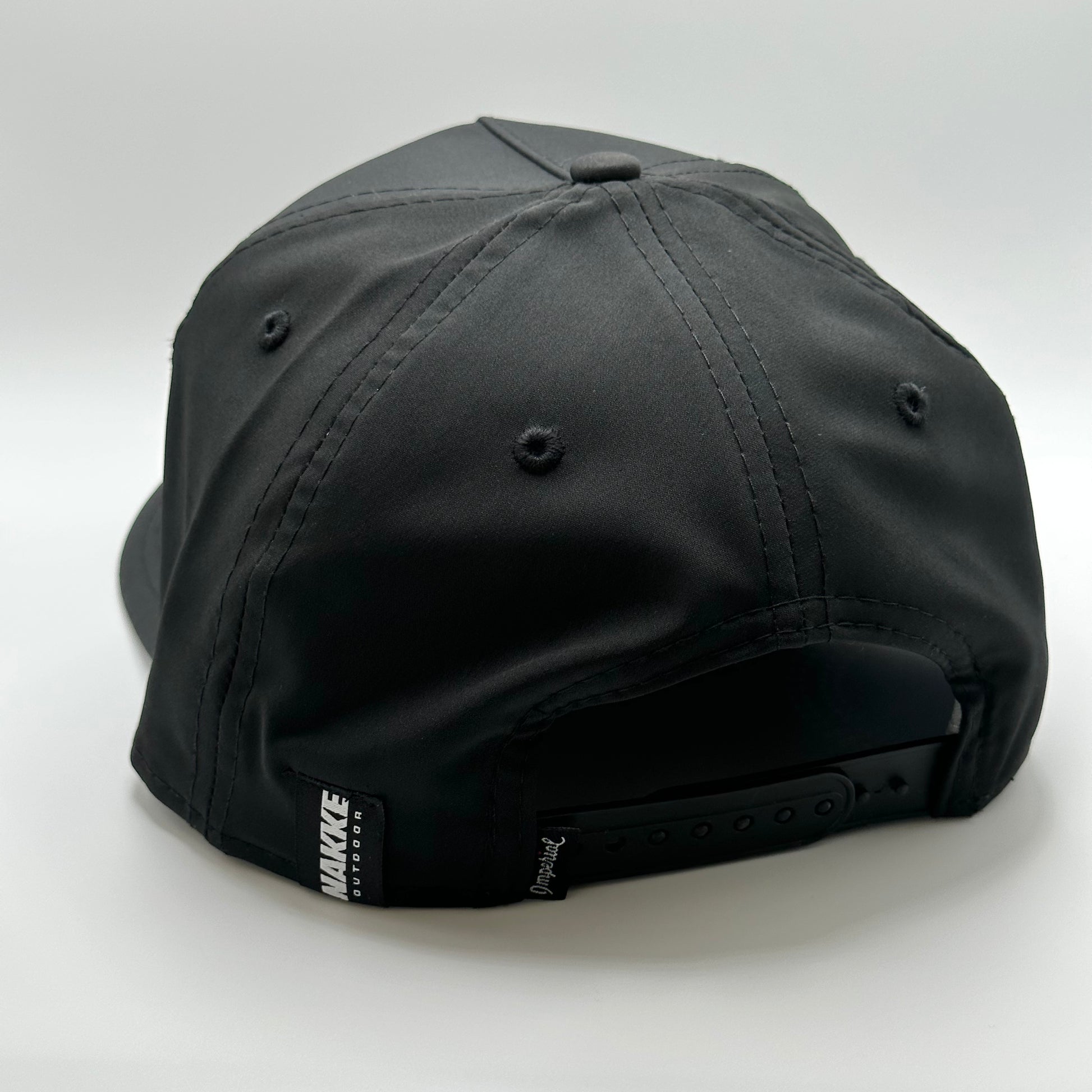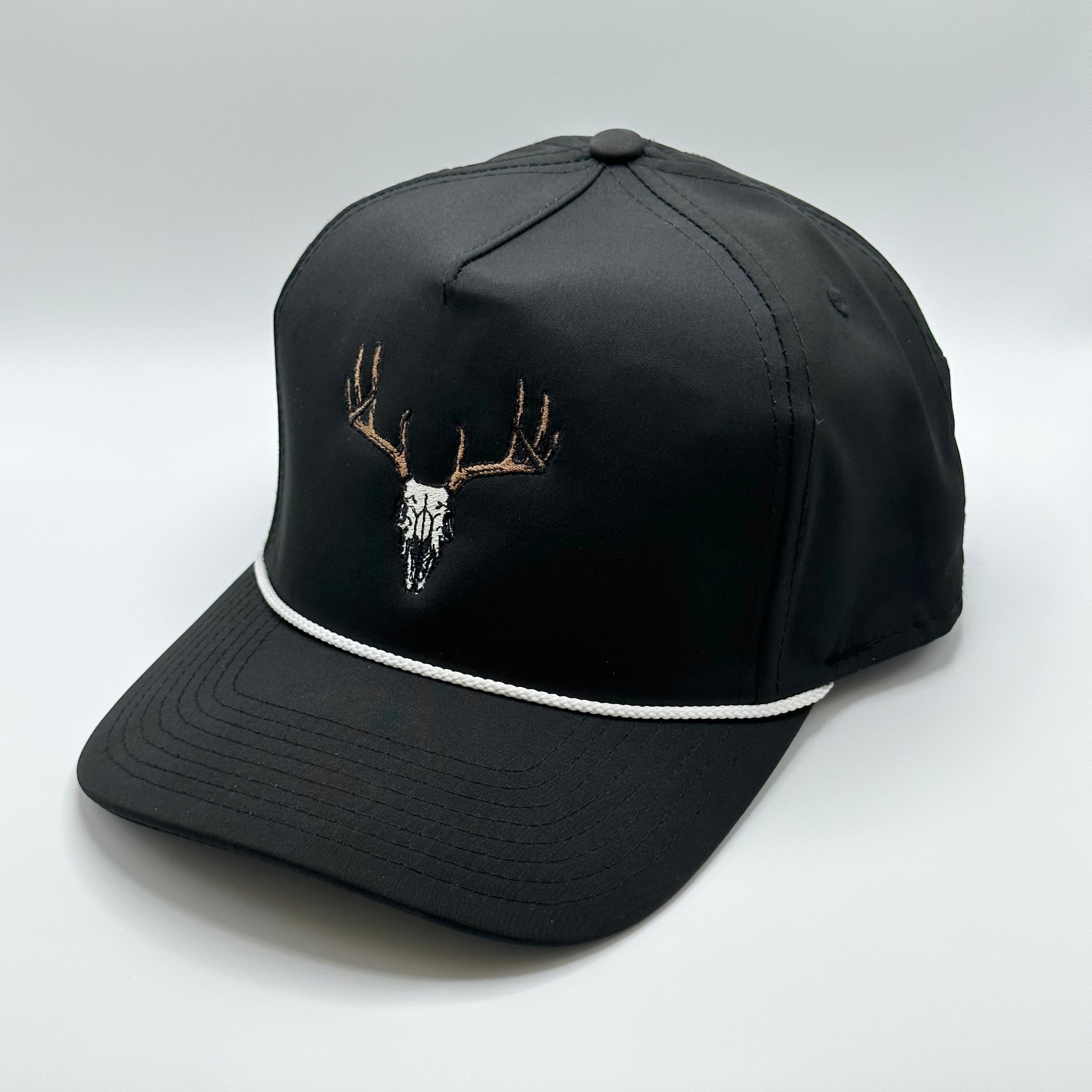 This Black hat offers a performance polyester fabric and a 5 panel retro fit for an iconic look. It features a brown and white embroidered buck skull and white woven rope along the base of the front panel for a distinctive design, as well as an adjustable plastic snap that ensures a perfect fit every time.
